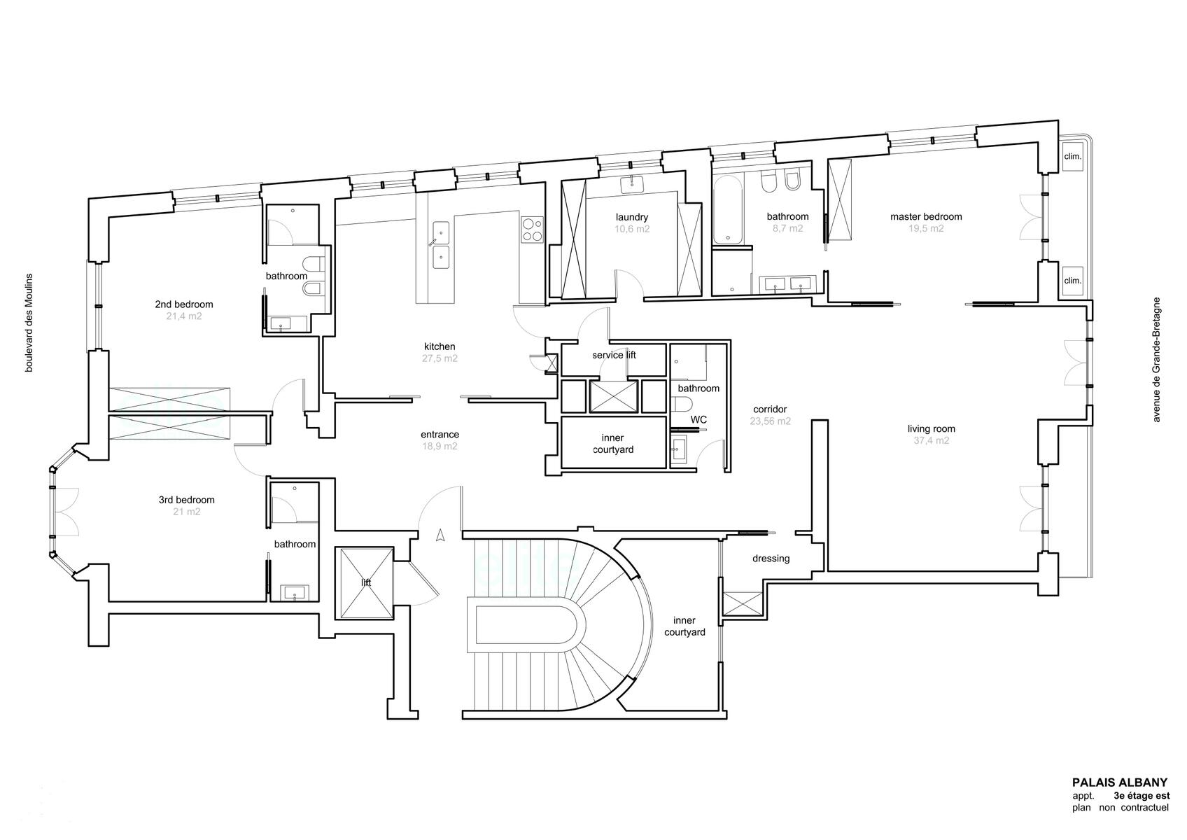 Le "Palais Albany" est un immeuble bourgeois situé au sein du quartier "Monte-Carlo" , sur le célèbre Boulevard des Moulins. Elégante résidence avec concierge, sécurisée et parfaitement entretenue.