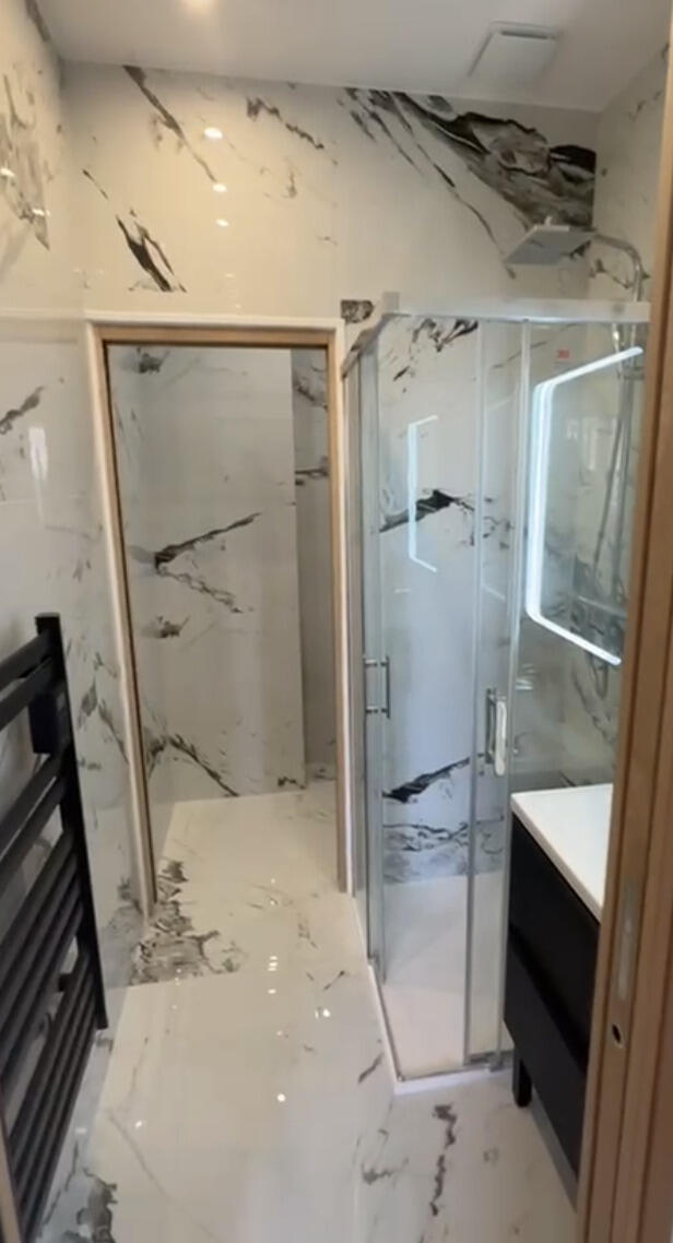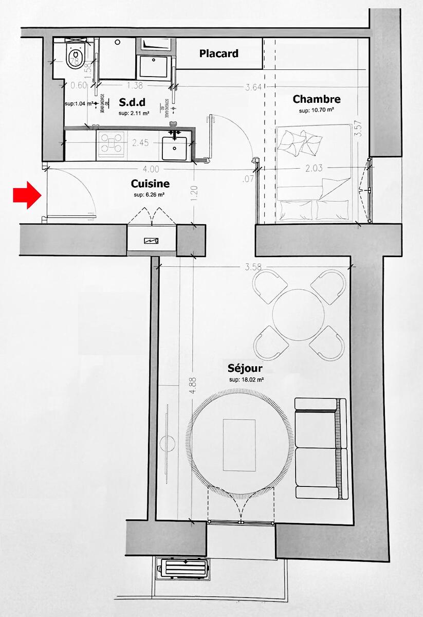 Entrée, kitchenette équipée, séjour, chambre avec rangement, salle douche complète, climatisation