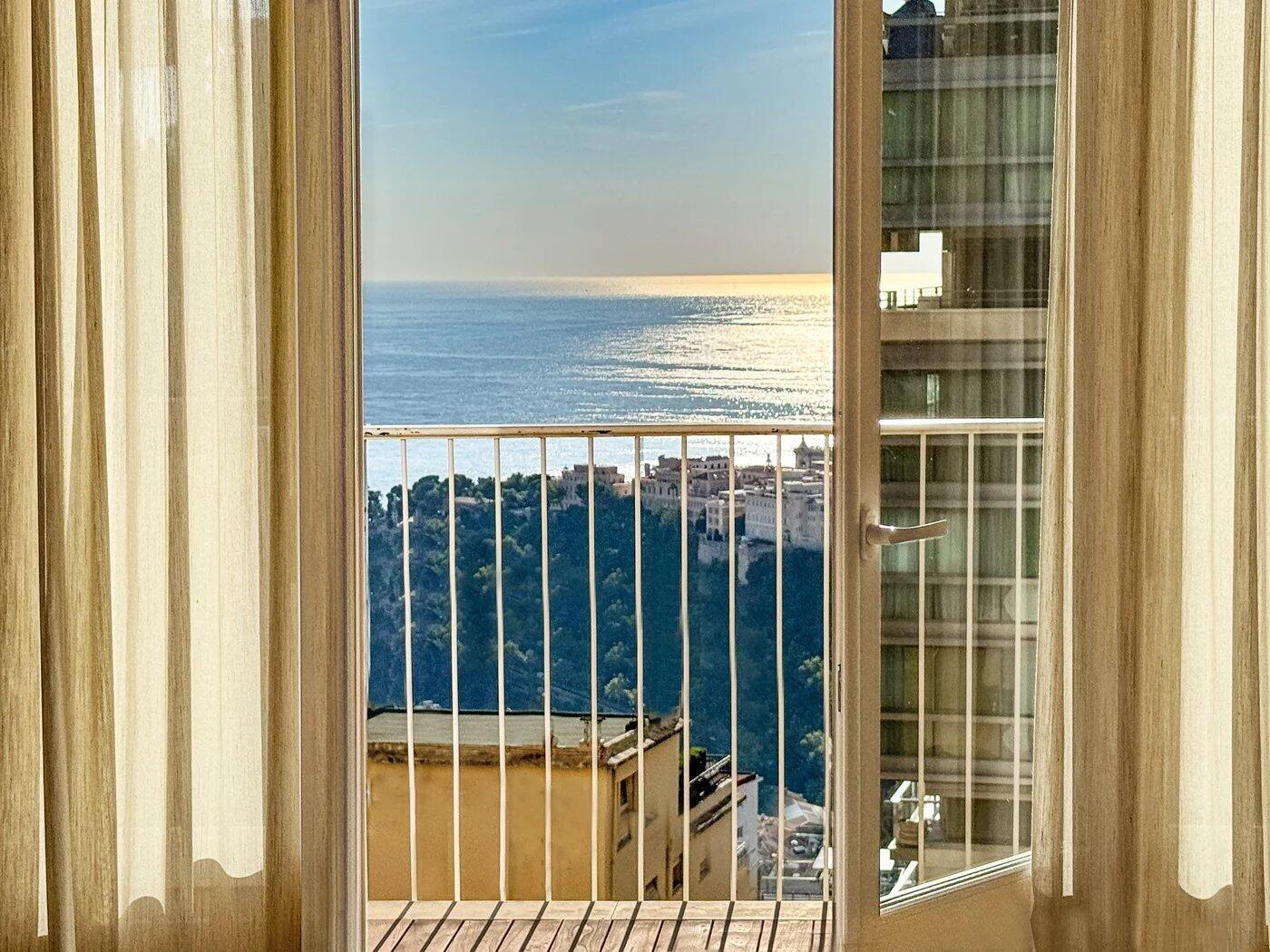 Ce bel appartement de 3 pièces se compose : d'une entrée, d'un séjour lumineux, d'une belle cuisine équipée, de 2 chambres avec chacune sa salle de bains, d'une belle terrasse avec vue sur la mer et sur le Rocher.