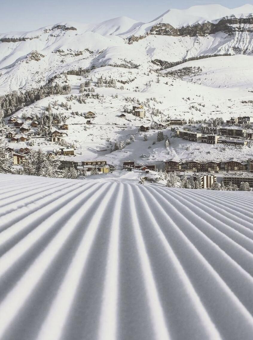 Exposé au Sud, il dispose de belles terrasses avec une vue panoramique surplombant la vallée et le domaine skiable.