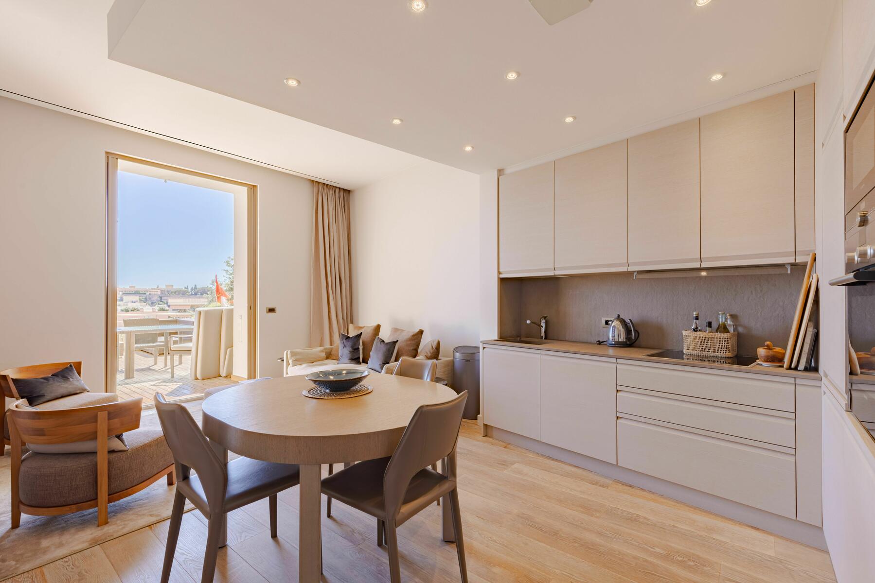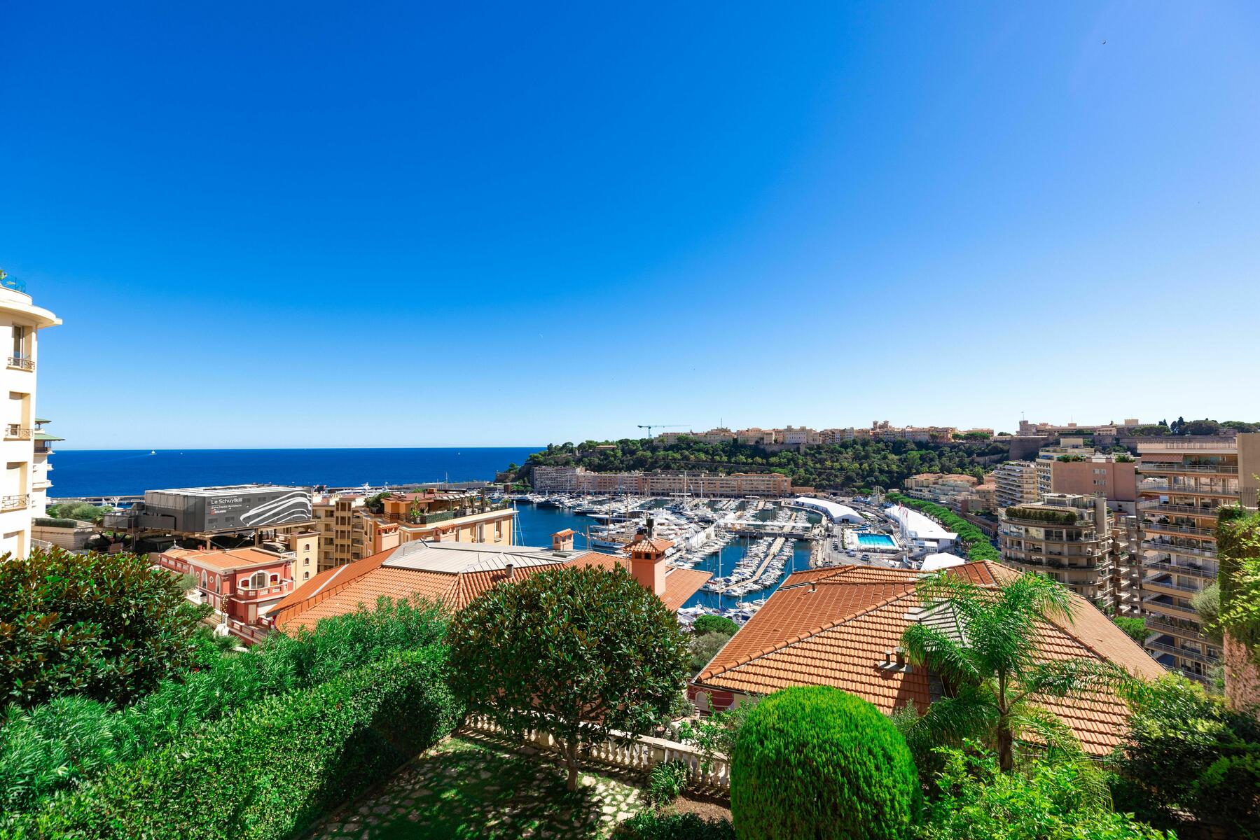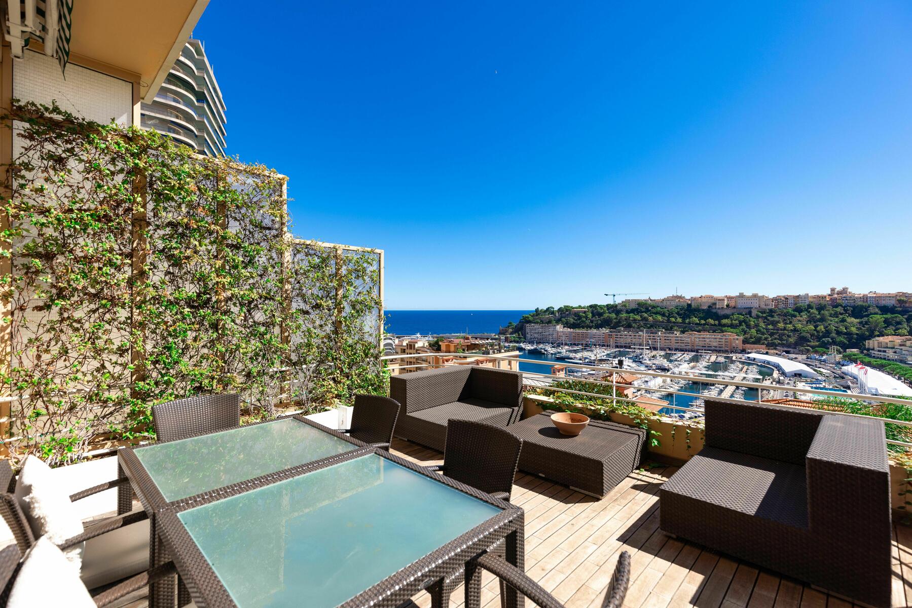 Splendido bilocale completamente ristrutturato con materiali di alta qualità, dotato di una magnifica terrazza con vista mozzafiato su Port Hercule, il Mar Mediterraneo e il Rocher di Monaco.