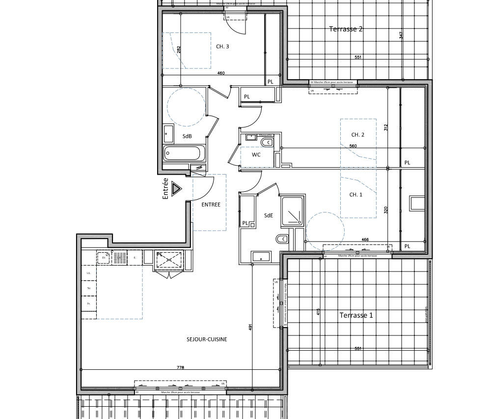 Si compone di un ingresso, un luminoso soggiorno con cucina a vista, tre camere da letto, un bagno, un bagno con doccia e un bagno per gli ospiti.