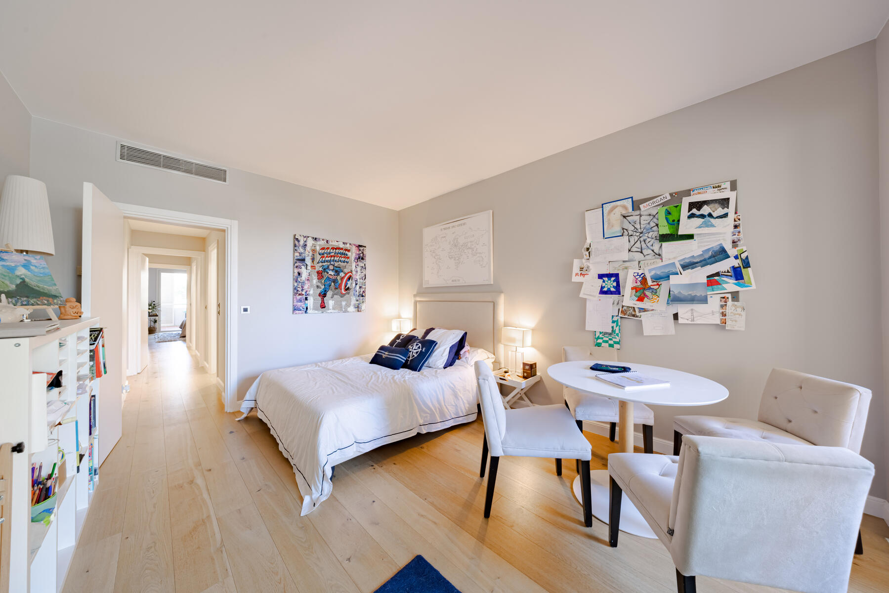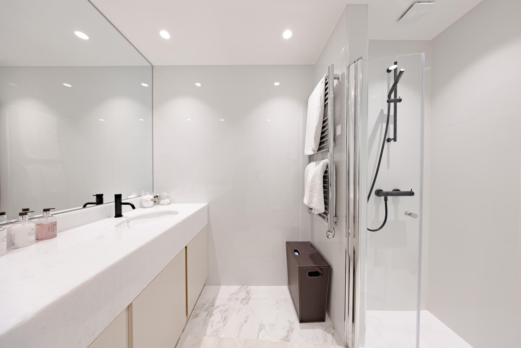 Gli interni spaziosi, inondati di luce naturale, offrono una zona giorno e pranzo elegante con ampie vetrate a tutta altezza che si aprono direttamente su ampie terrazze. La cucina separata è completamente attrezzata con elettrodomestici di alta gamma e comprende anche una pratica zona lavanderia.