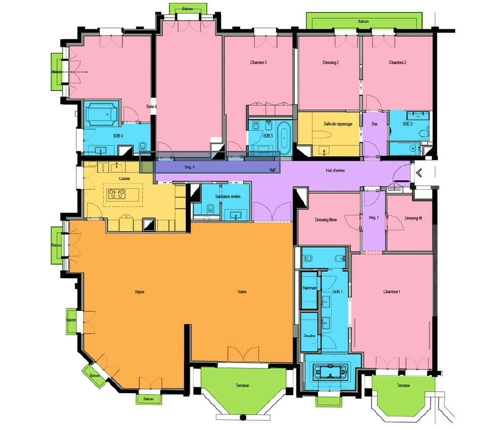 L’appartamento comprende un ingresso, un salone e una zona pranzo con accesso a terrazza, una cucina indipendente completamente attrezzata, una suite padronale con terrazza, due cabine armadio e bagno, oltre a tre ulteriori camere, ciascuna con cabina armadio o bagno e balcone privato. Una sala da stiro e servizi per gli ospiti completano la disposizione interna.