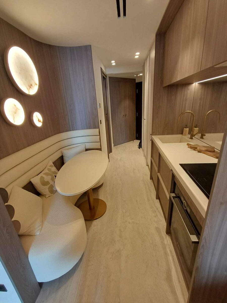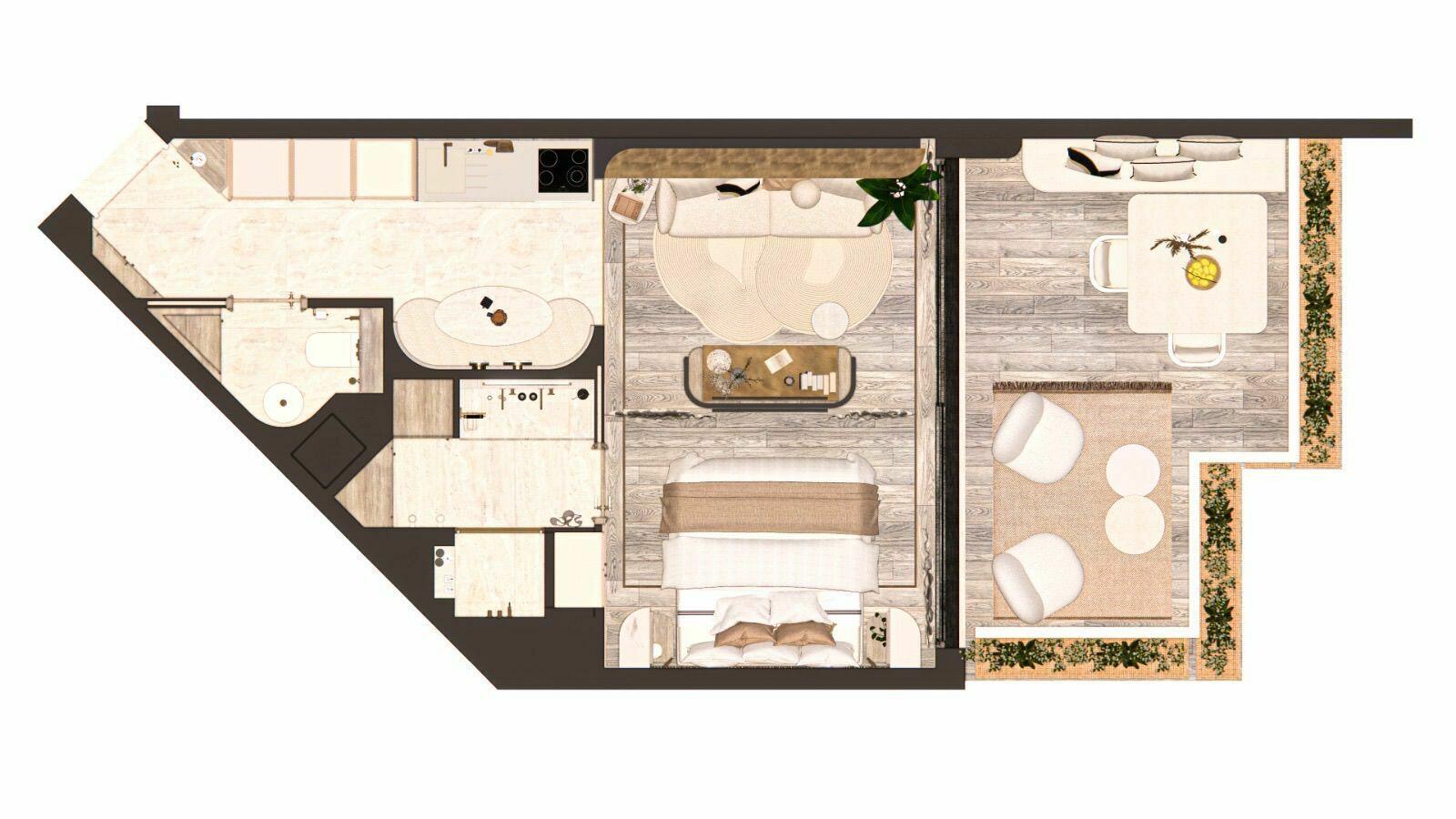 L'appartamento è composto da un ingresso, un bagno per gli ospiti, una cucina attrezzata, una zona soggiorno con zona pranzo, una zona notte, un bagno con doccia e una terrazza di 18 m2.