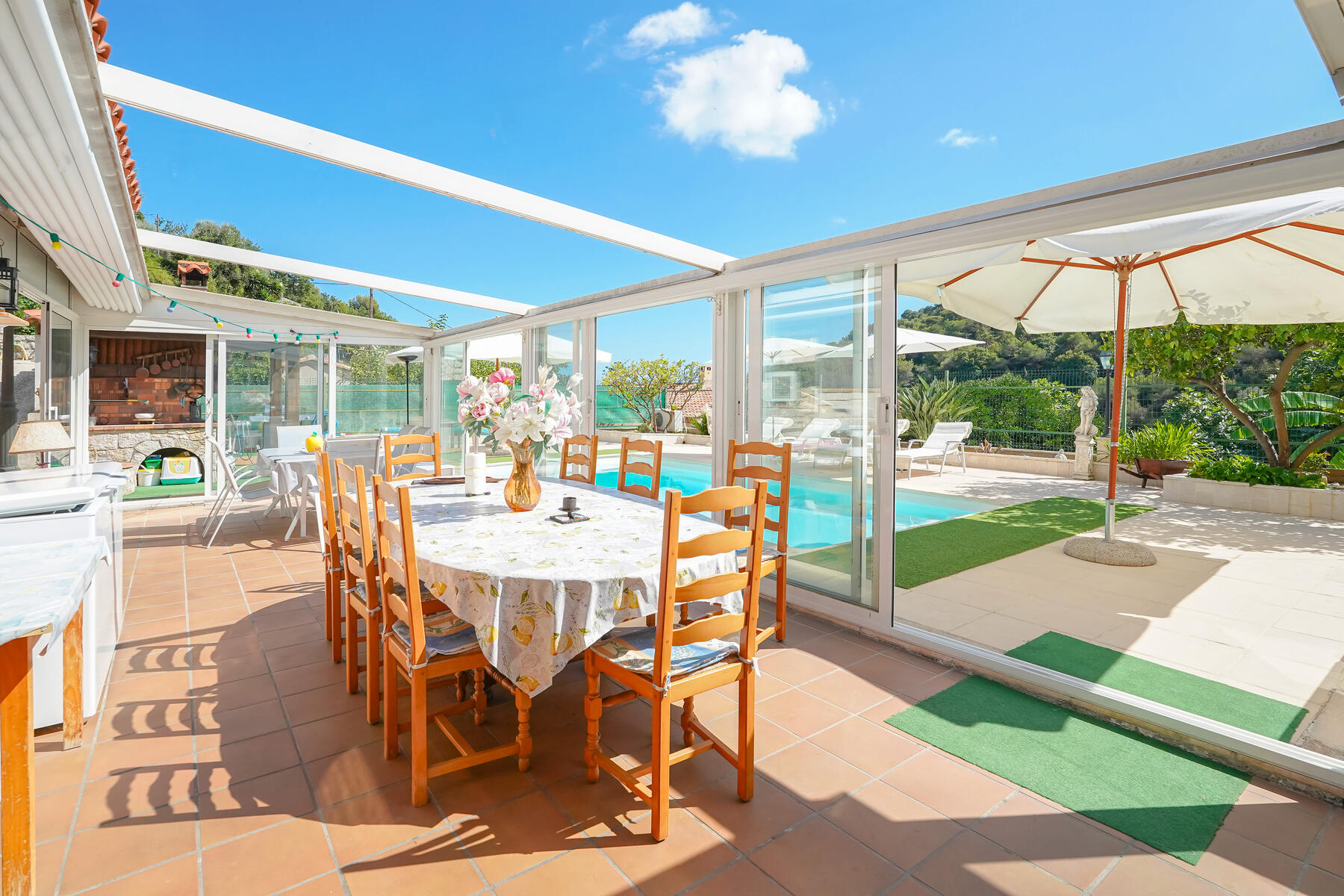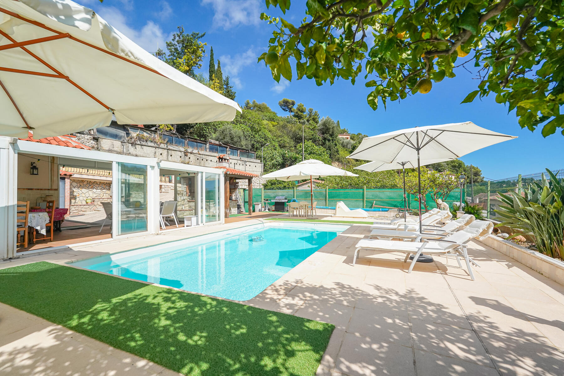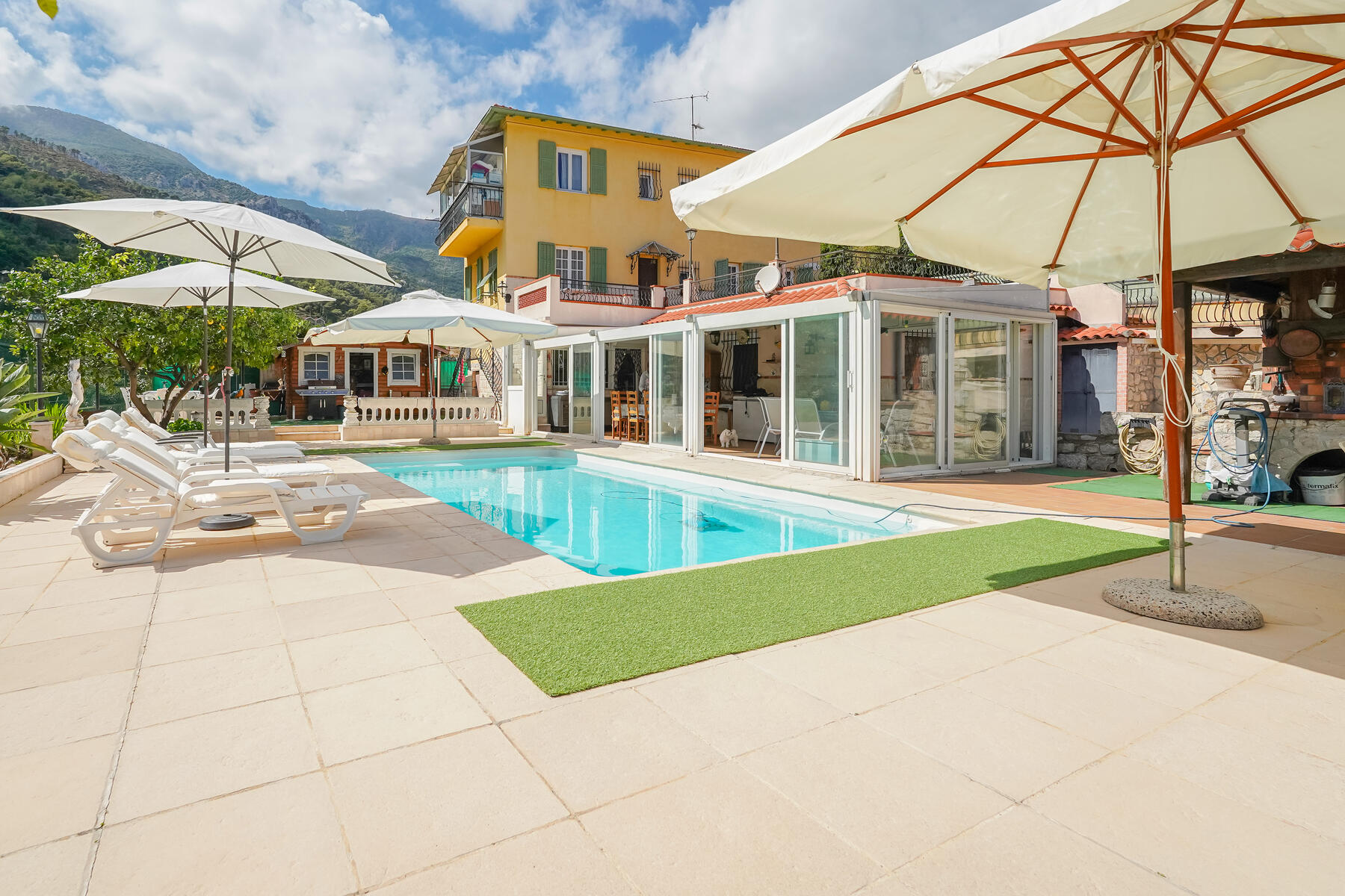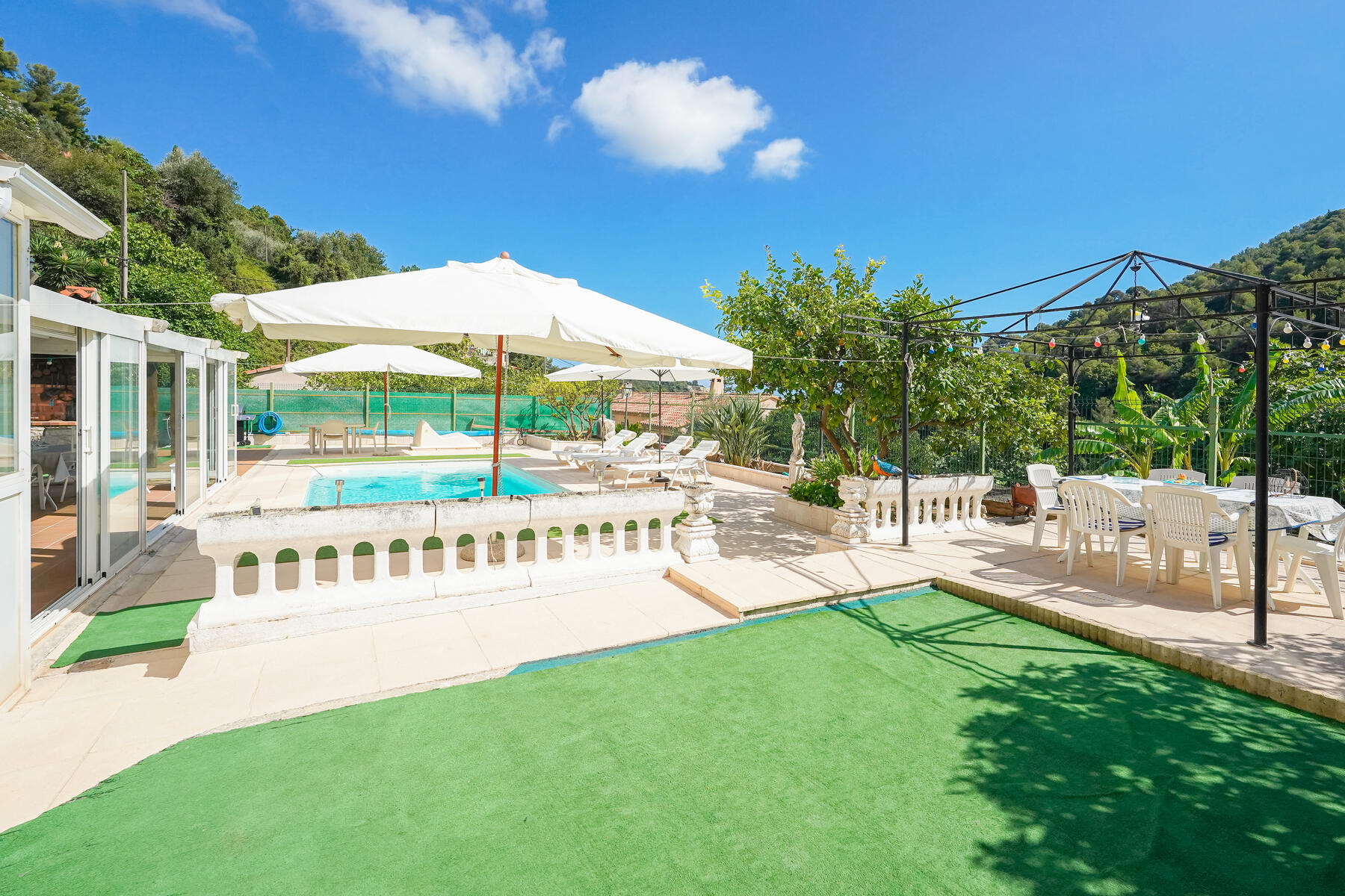 L'esterno offre un bel spazio abitativo con ampia terrazza, una piacevole piscina, una spaziosa veranda, un giardino con una casetta da giardino di 14 m² e un sistema di irrigazione alimentato con acqua di sorgente. Potrete godere di una vista aperta sulle montagne e di una vista parziale sul mare. L'esposizione a ovest garantisce una bella luminosità.