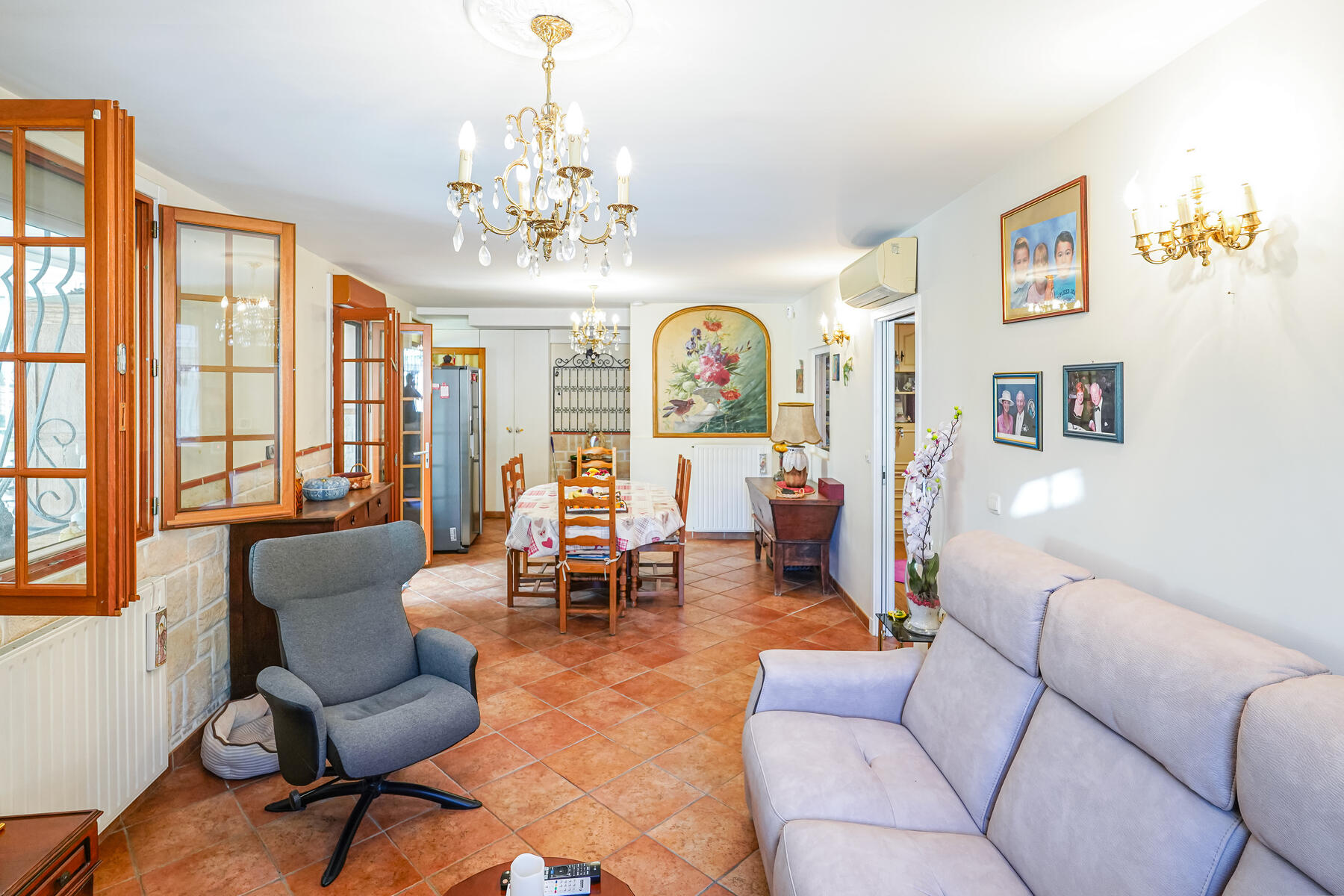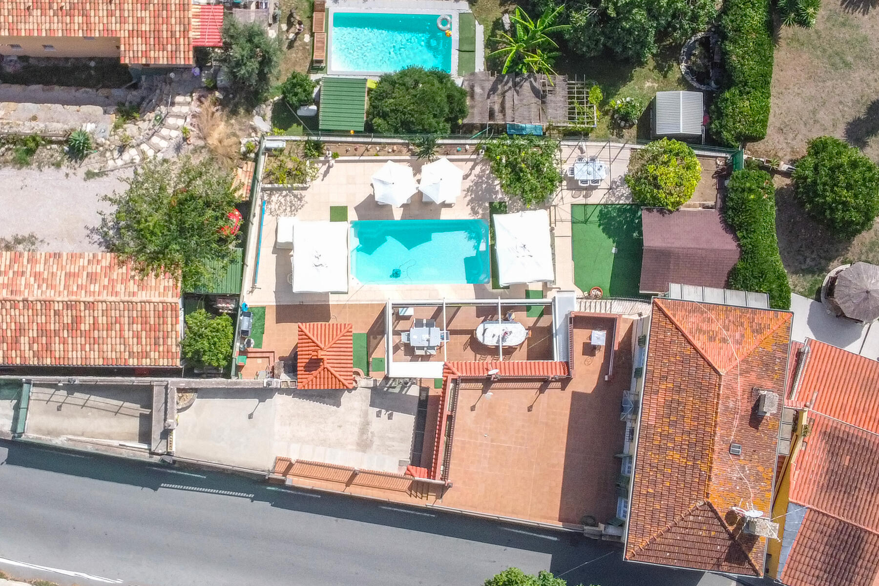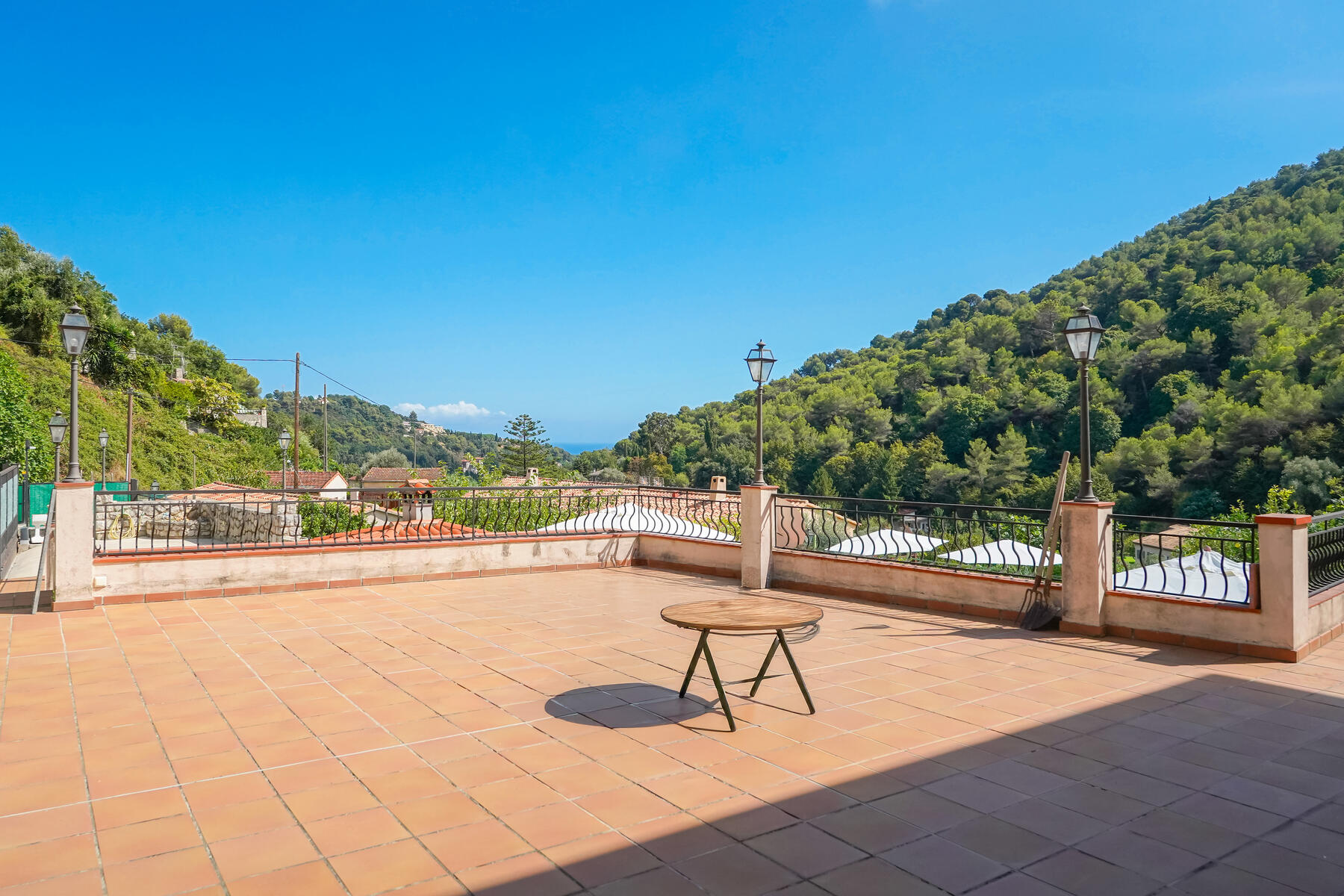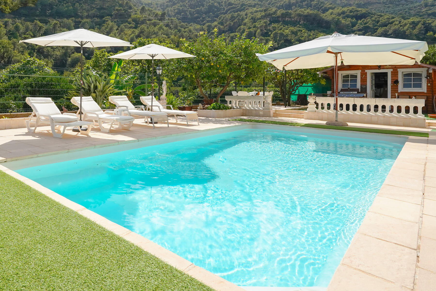 L'esterno offre un bel spazio abitativo con ampia terrazza, una piacevole piscina, una spaziosa veranda, un giardino con una casetta da giardino di 14 m² e un sistema di irrigazione alimentato con acqua di sorgente. Potrete godere di una vista aperta sulle montagne e di una vista parziale sul mare. L'esposizione a ovest garantisce una bella luminosità.