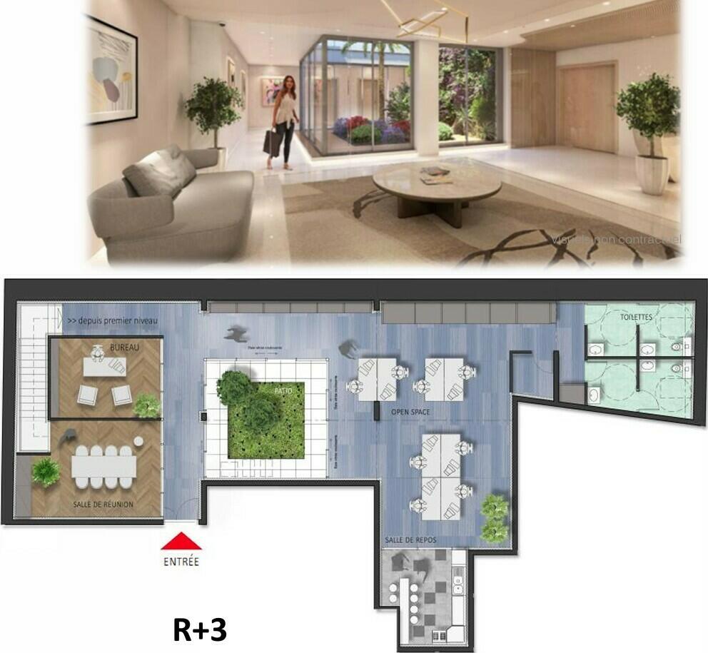 Un patio centrale di 24,40 m² struttura l'intero e offre una luce naturale apprezzabile, favorendo un ambiente di lavoro qualitativo e rilassante.