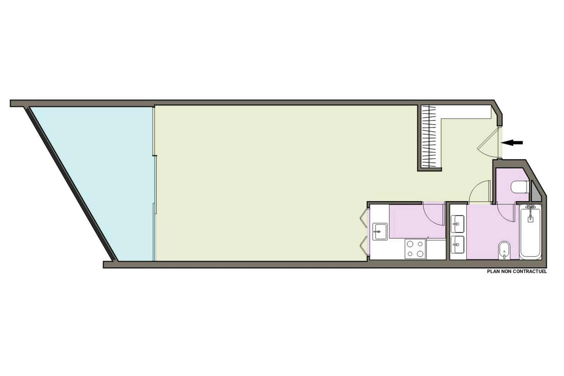 Con una superficie di 54 m², di cui 12 m² di terrazza, l'appartamento è composto come segue: Un ingresso con armadi a muro, un bagno con wc, una cucina attrezzata e un ampio soggiorno aperto sulla terrazza.