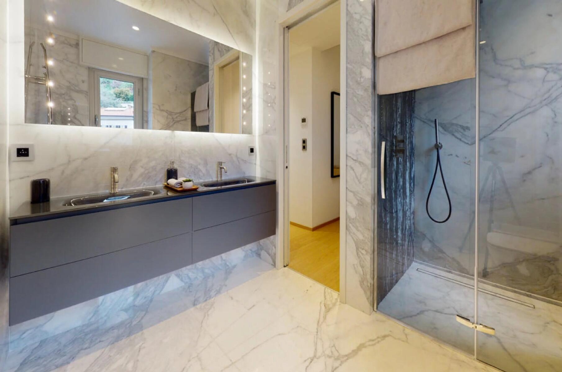 L'appartamento è composto da un elegante ingresso, un ampio e luminoso soggiorno/sala da pranzo, una cucina a pianta aperta completamente attrezzata, due comode camere da letto e due moderni bagni, che offrono un ambiente di vita lussuoso ma funzionale.