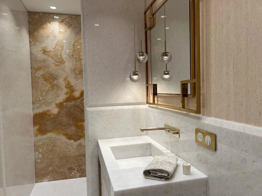 Il pavimento in marmo aggiunge un tocco di classe all'appartamento. La cucina a vista completamente attrezzata presenta un piano di lavoro in marmo bianco e un tavolo da pranzo con tocchi d'oro.