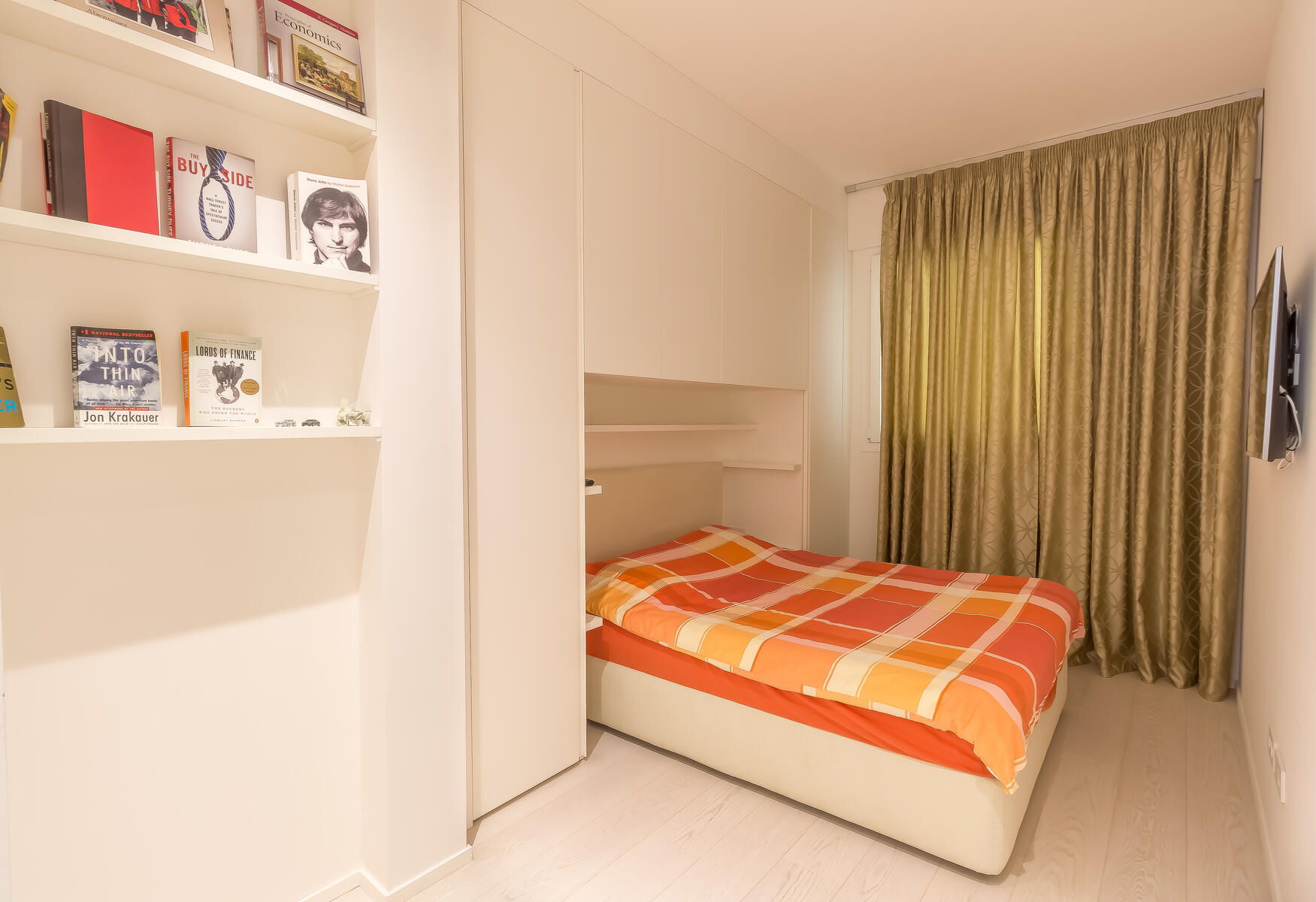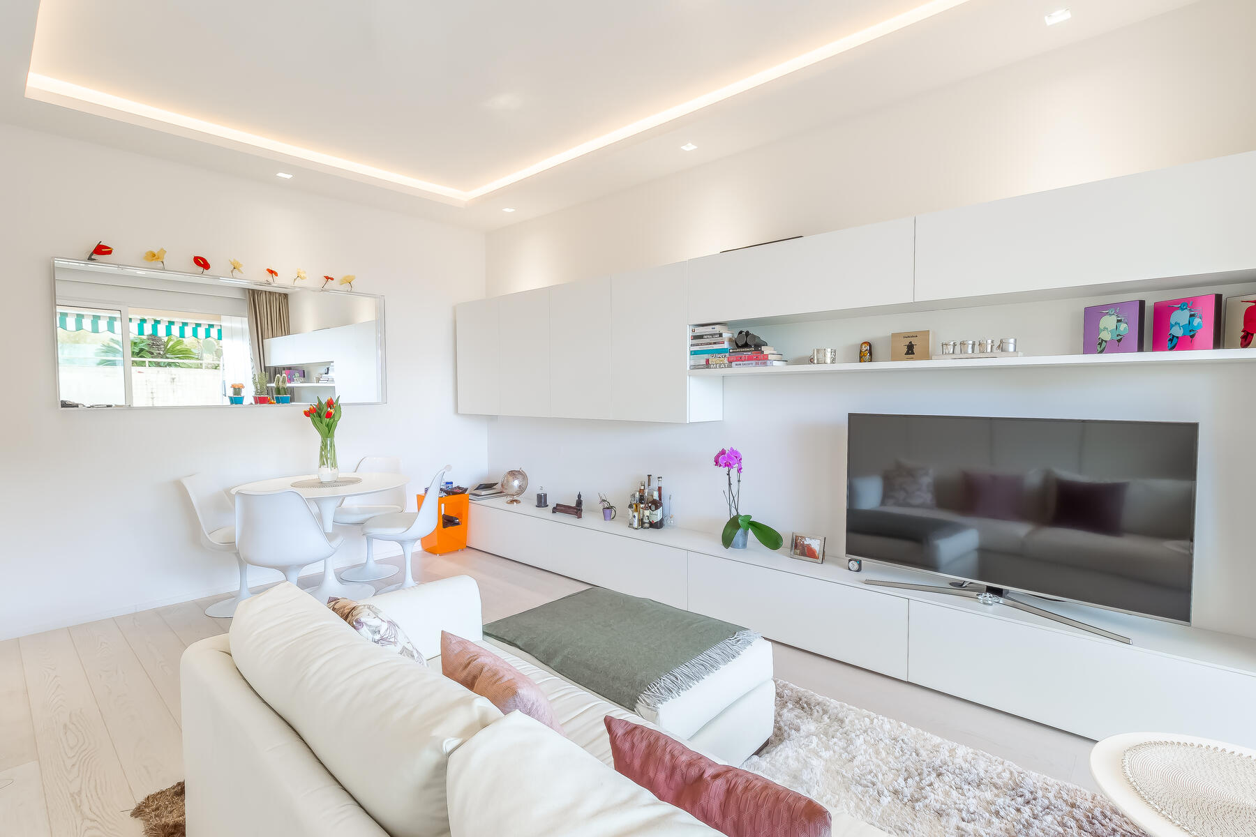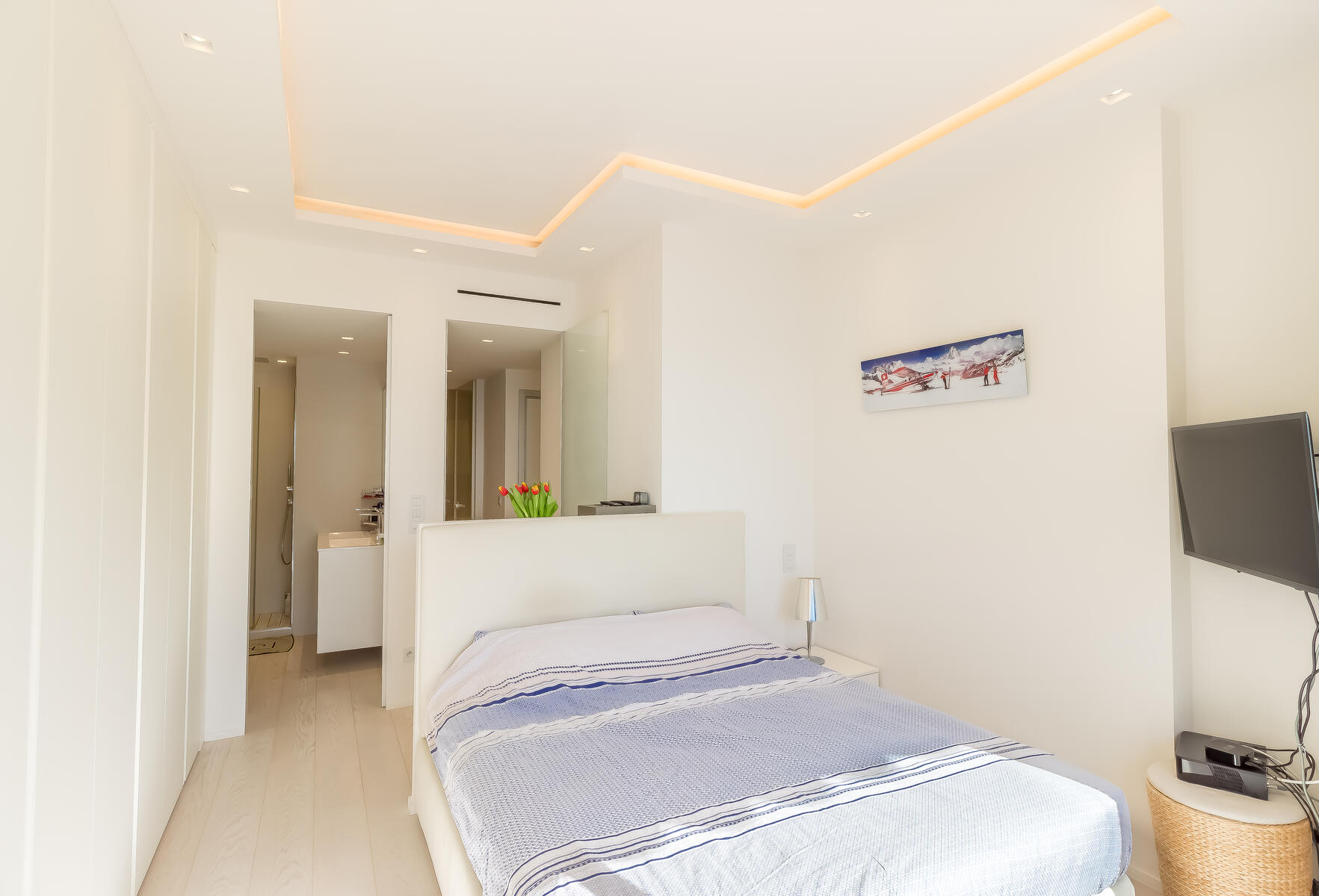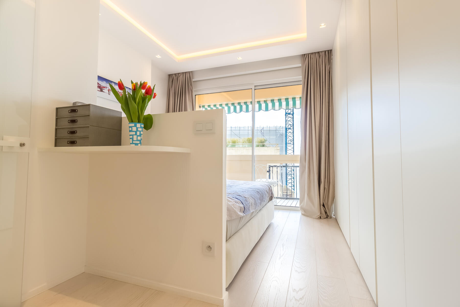 Gli spazi sono ottimizzati grazie a numerose soluzioni per lo stoccaggio. Una delle camere, insieme al soggiorno, si apre su un’ampia terrazza che regala una vista mozzafiato sul mare — perfetta per momenti di relax o per intrattenere gli ospiti.
