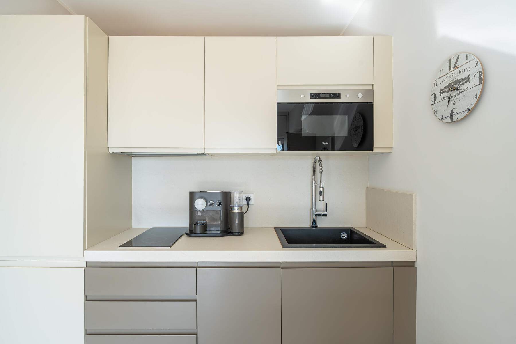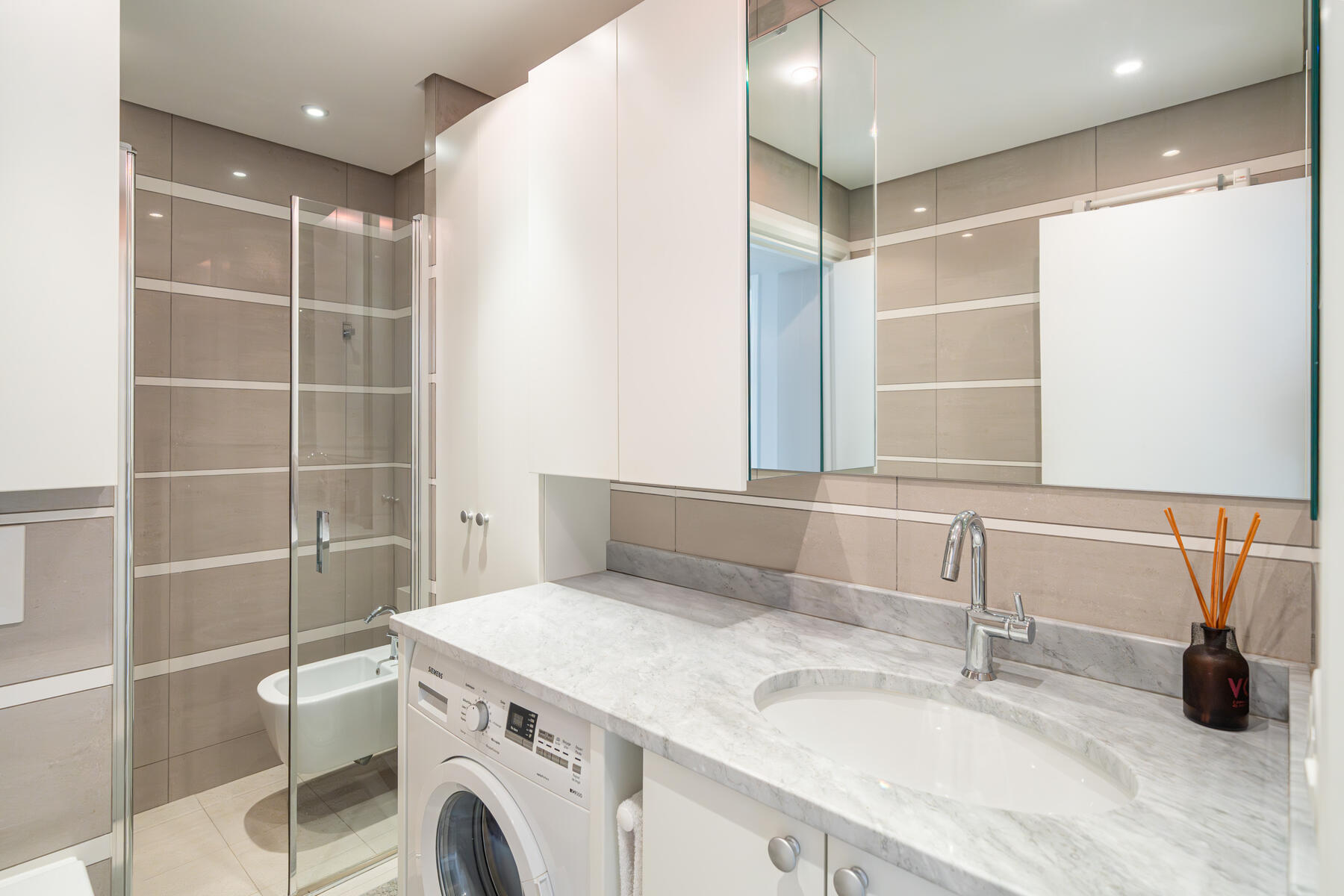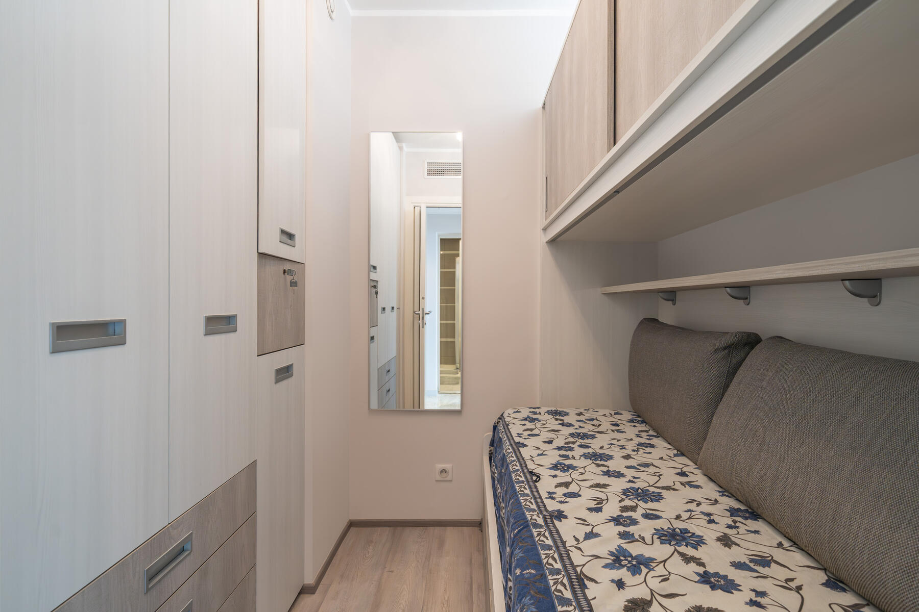 È composto da: ingresso, soggiorno che si apre su una terrazza, cucina attrezzata aperta sul soggiorno, una camera da letto/ ufficio e un bagno completo con doccia.